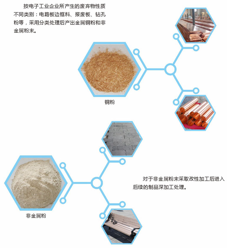 該設備及處理工藝綜合了目前國內外最先進的粉碎與解離技術,形成了獨特的處理工藝,整個處理過程在一條全封閉的生產線上運行,金屬損耗率可控制在2%以下,完全物理加工, 無廢水、廢物、廢氣排放;分離的非金屬粉末可實現再利用。
